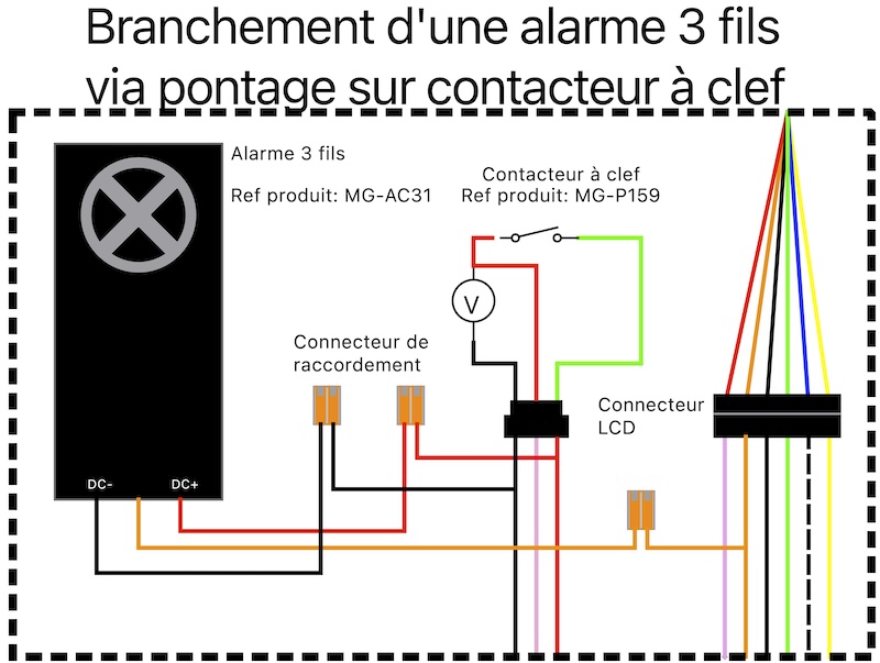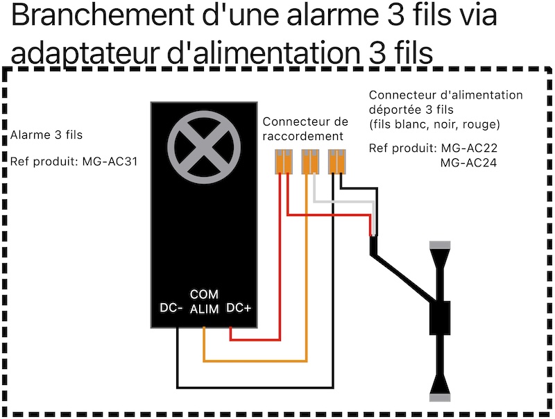 Alarme pouvant être connectée avec 3 fils pour montage directe avec fonctionnement coupe circuit.