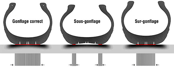 Un pneu insuffisamment gonflé se déforme fortement lors des passages d’obstacles. Cette déformation excessive entraîne des pincements de la chambre à air, mais aussi une usure accélérée du pneu, une baisse de l'adhérence et une augmentation de la résistance au roulement.